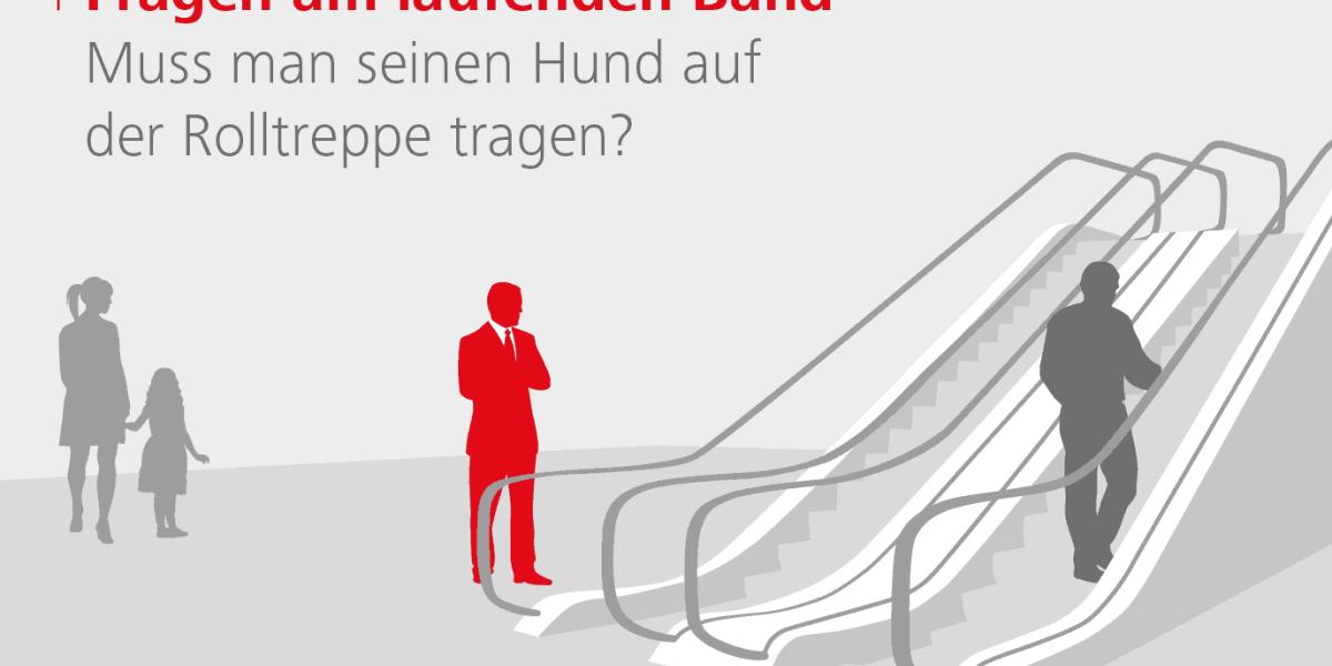 Wieso, weshalb, warum – so groß wie die Rolltreppen selbst sind auch die Fragen, die sich um sie ranken. Aber jeden Monat wird es eine weniger, denn unser Fahrtreppen-Experte Siny Thottakara beantwortet für den Senkrechtstarter die Fragen am laufenden Band. Dieses Mal: Müssen Frauchen und Herrchen ihre Hunde auf der Fahrtreppe tragen?
